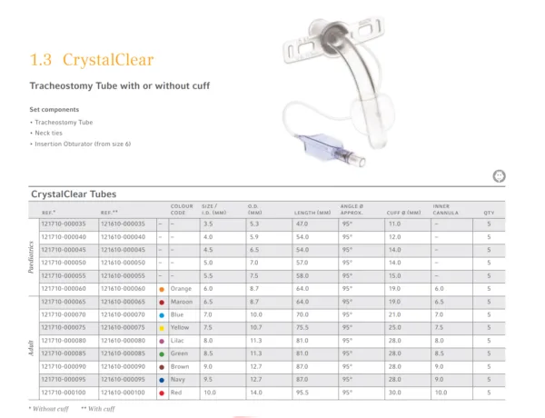 Трахеостомічна набір CrystalClea: • трахеостомічна трубка з RUSCHELIT з манжеткою низького тиску, клапан для шприців Luer і Luer-lock, блакитний пілот-балон, коннектор що обертається , Rö-маркер по всій довжині; • обтуратор; • стрічка кріплення. Стерильно.