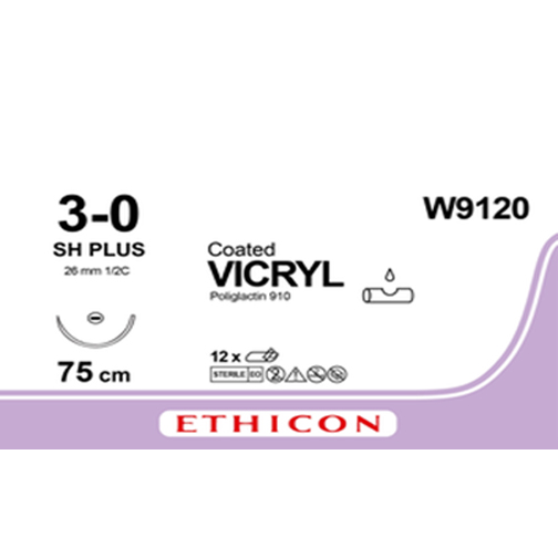 Вікрил – синтетичний шовний матеріал, що розсмоктується, який широко застосовується для апроксимації м’яких тканин і накладення лігатур, включаючи офтальмологічні операції, для зшивання периферичних нервів, а також в мікрохірургії для зшивання судин, діаметр яких менше 2 мм. Синтетичний, плетений шовний матеріал з середнім терміном розсмоктування, що забезпечує високу міцність швів, коли це дійсно необхідно. Властивості: плетена нитка – для гарних маніпуляційних властивостей і надійної фіксації вузлів; комбінація акуратно сплетених монофіламентов і хімічно зв’язане покриття всієї нитки – ключ до відмінних маніпуляційних властивостей і до гладкого проходження через тканини, за рахунок дизайну плетіння, вузол, зав’язаний при заданому зусиллі, забезпечує зіставлення кінців рани; з покриттям – для нетравматичними проходження через тканини і легкого спускання вузлів, нитка VICRYL виготовляється методом плетіння з тонких волокон гліколевої та молочної кислоти. Особливе покриття нитки покращує її властивості і робить їх оптимальними як для хірурга, так і для пацієнта; синтетична нитка – мінімальна тканинна реакція; матеріал, що розсмоктується – процес розсмоктування шляхом гідролізу, розсмоктування Вікрилу з покриттям зазвичай відбувається в проміжку між 56-ою і 70-ою добою; міцність на розрив; колір – фіолетовий або незабарвлений; товщина нитки – варіюється від 8/0 до 2 (USP), поставляються як нитки з голкою, так і лігатури; стерилізація – оксидом етилену; монофіламентна нитка Вікрил – виготовляється в двох розмірах 9/0 та 10/0, застосовується в хірургії ока; голки – найширша лінійка голок, виготовлених зі спеціального сплаву Еталлой, який забезпечує на 40% більшу стійкість до згинання, порівняно зі звичайною хірургічної сталлю; упаковка – більшість ниток Вікрил упаковані в спеціальну одинарну стерильну упаковку relay, яка дозволяє знизити до мінімуму ефект пам’яті форми, і забезпечує швидке витягання нитки в операційній перед подачею хірургу.