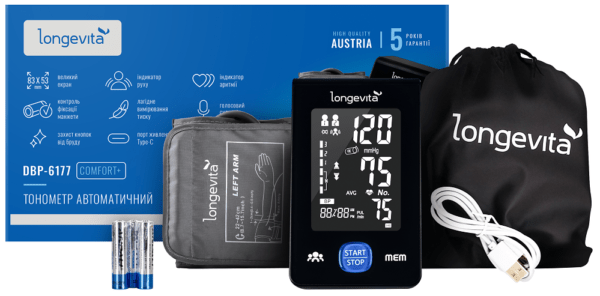 Longevita DBP-6177 Comfort+ – це поєднання сучасних технологій, точності, зручності та високої якості. Цей тонометр стане надійним помічником для регулярного моніторингу вашого здоров’я та ідеально підійде для використання як вдома, так і в медичних установах.