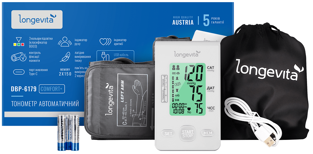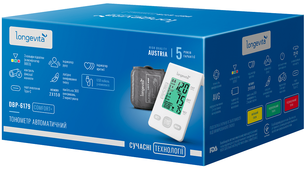 Модель Longevita DBP-6179 Comfort+ належить до серії тонометрів, що забезпечують комфорт і функціональність. Тонометри бренду Longevita вирізняються австрійською якістю та досконалістю, відповідаючи потребам людей різного віку.