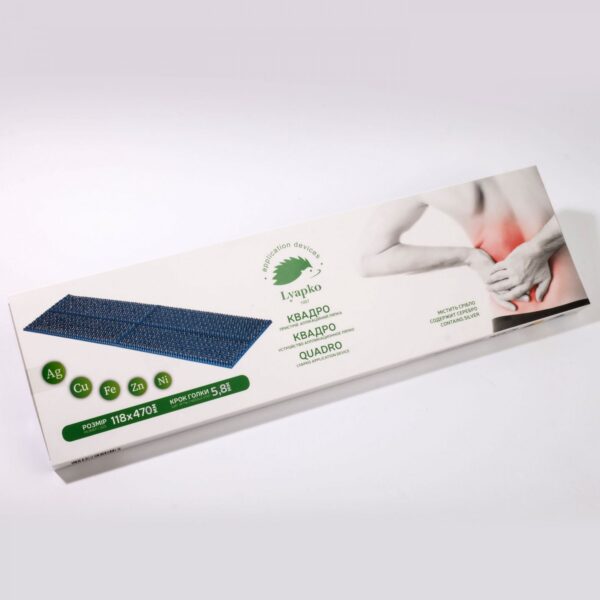 Аплікаційний пристрій Ляпко “Квадро” має розмір 118х470 мм, крок голок 5,8 мм і містить 1780 голок. Це універсальний аплікатор, який можна використовувати для різних зон тіла. При необхідності він може бути розрізаний на 2 або 4 частини (поздовжньо чи поперечно), що дозволяє впливати вибірково на окремі ділянки тіла та налаштовувати тривалість впливу кожного сегмента.