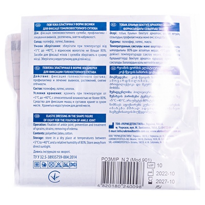 Склад пов’язки включає: поліефір, латекс та бавовну. Розмір пов’язки підбирається в залежності від обхвату щиколотки для забезпечення правильної посадки та ефективної підтримки.