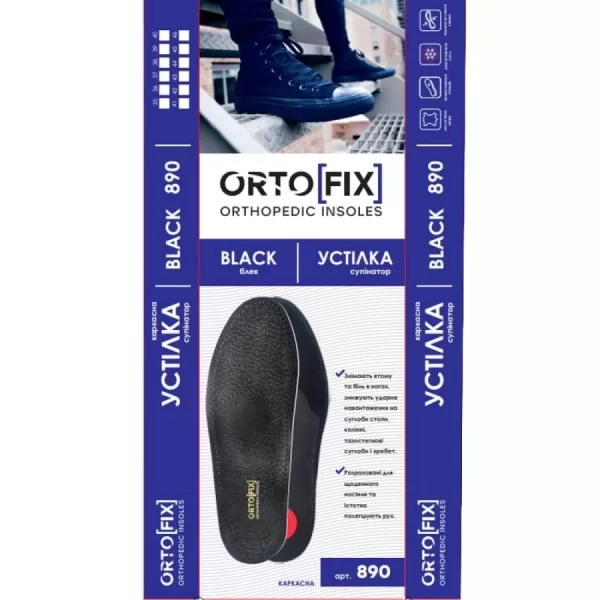Ортопедичні устілки Ortofix 890 Black призначені для щоденного взуття та рекомендуються для лікування та профілактики різних видів плоскостопості, вальгусної та плоско-вальгусної установки стопи. Ці устілки підходять для спортивного та повсякденного взуття без високого підбору.