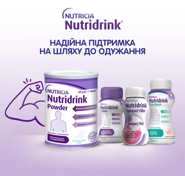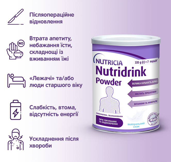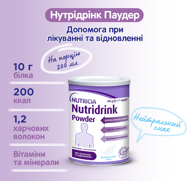 Спеціалізоване ентеральне харчування Nutridrink Powder Neutral Flavour – суха суміш із підвищеним вмістом білка та енергії, збагачена вітамінами й мінералами, розроблена для дієтичного раціону дорослих із нутритивною недостатністю.